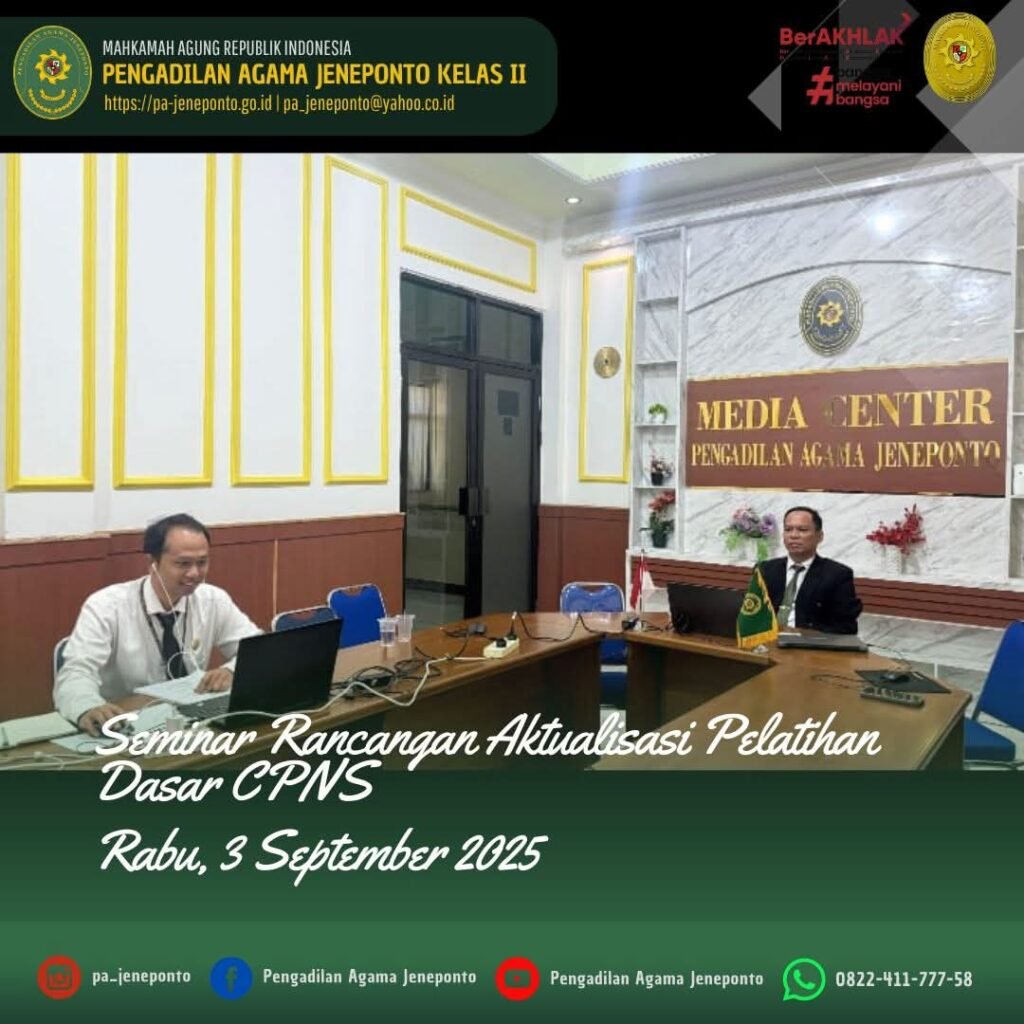 Kegiatan Seminar Rancangan Aktualisasi telah dilaksanakan secara virtual pada hari Rabu, 3 September 2025, bersama para Peserta, Mentor, Coach dari BPS RI, serta Penguji dari Mahkamah Agung RI.