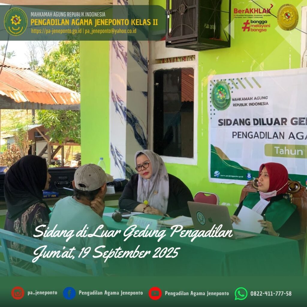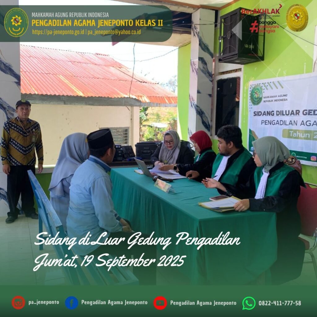 Pengadilan Agama Jeneponto kembali melaksanakan Sidang di Luar Gedung Pengadilan (Sidang Keliling XVIII) di Kantor Desa Kaluku, Kecamatan Batang, Kabupaten Jeneponto. Adapun Majelis Hakim yang bersidang yaitu Muhammad Arif, S.H., didampingi Hakim Anggota Marwani R, S.H. dan Ulin Nadya Rif’atur Rohmah, S.H. serta Muhammad Iskandar Zulkarnain, S.H.I., dan Ardhayani Arja, S.H.I., masing-masing sebagai Panitera Pengganti, serta Suryani, S.E., dan Mudassir, sebagai Admin Sidang Keliling. Adapun perkara yang disidangkan sebanyak 6 perkara, sidang berlangsung dengan tertib tanpa kendala.