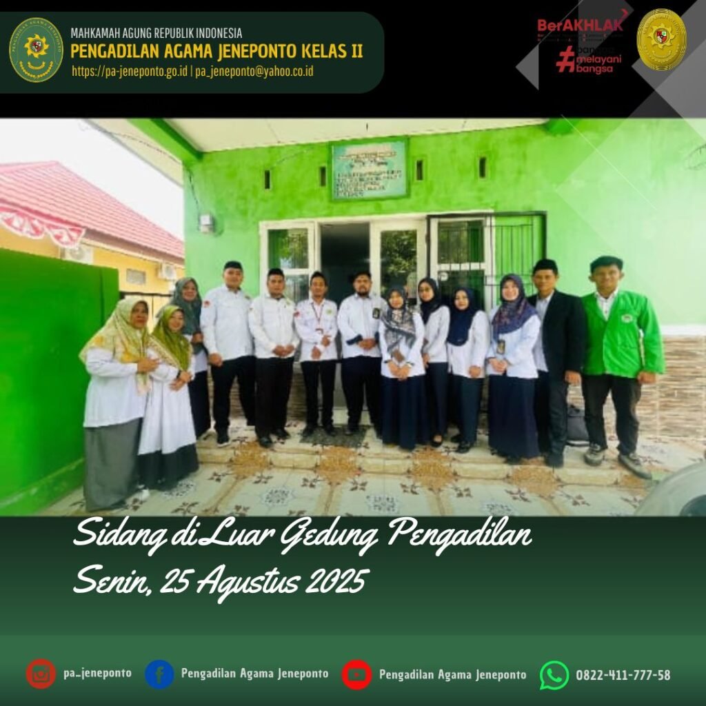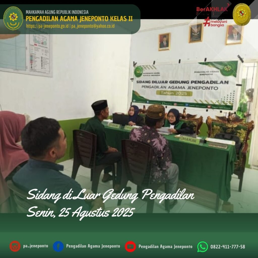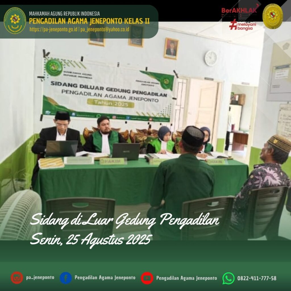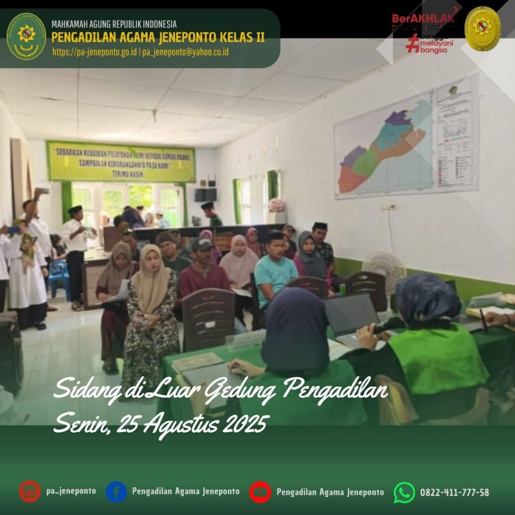 Pengadilan Agama Jeneponto kembali melaksanakan Sidang di Luar Gedung Pengadilan (Sidang Keliling XV) di Kantor Urusan Agama (KUA) Kecamatan Arungkeke, Kabupaten Jeneponto. Adapun Majelis Hakim yang bersidang yaitu Fadilah, S.Ag., M.H., Ketua Majelis, Muhammad Arif, S.H., dan Ulin Nadya Rif’atur Rohmah, S.H., masing-masing sebagai Hakim Anggota serta Muniroh Nahdi, S.H., M.H., dan Ardhayani Arja, S.H.I., masing-masing sebagai Panitera Pengganti, serta Amel Ryski Prasilya R. Abas. P, S.H, dan Muh. Nurul Ulum, S.E.I., sebagai Admin Sidang Keliling. Adapun perkara yang disidangkan sebanyak 10 perkara, sidang berlangsung dengan tertib tanpa kendala.