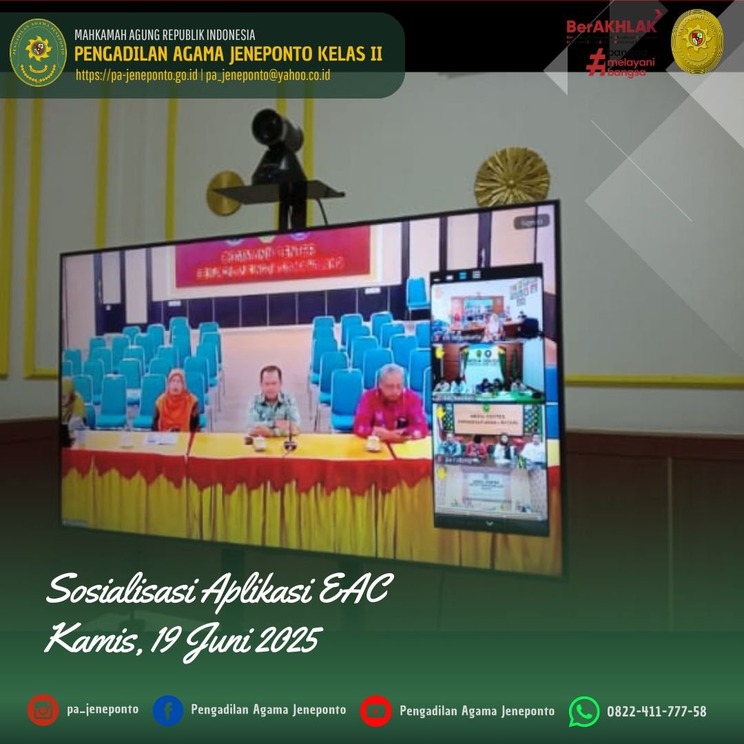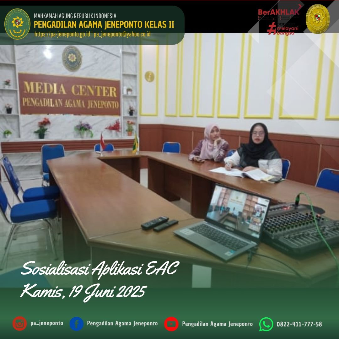 Kamis pagi pukul 09.00 s.d. selesai, bertempat di Media Center Pengadilan Agama Jeneponto, Amel Ryski Prasilya R. Abas P. (Analis Perkara Peradilan), dan Adinda Nurul Aulia Maksun, S.H., (CPNS) mengikuti Zoom Meeting dengan tema “Sosialisasi penggunaan Aplikasi EAC pada APS versi 3.0”, secara Daring oleh Ditjen Badilag.