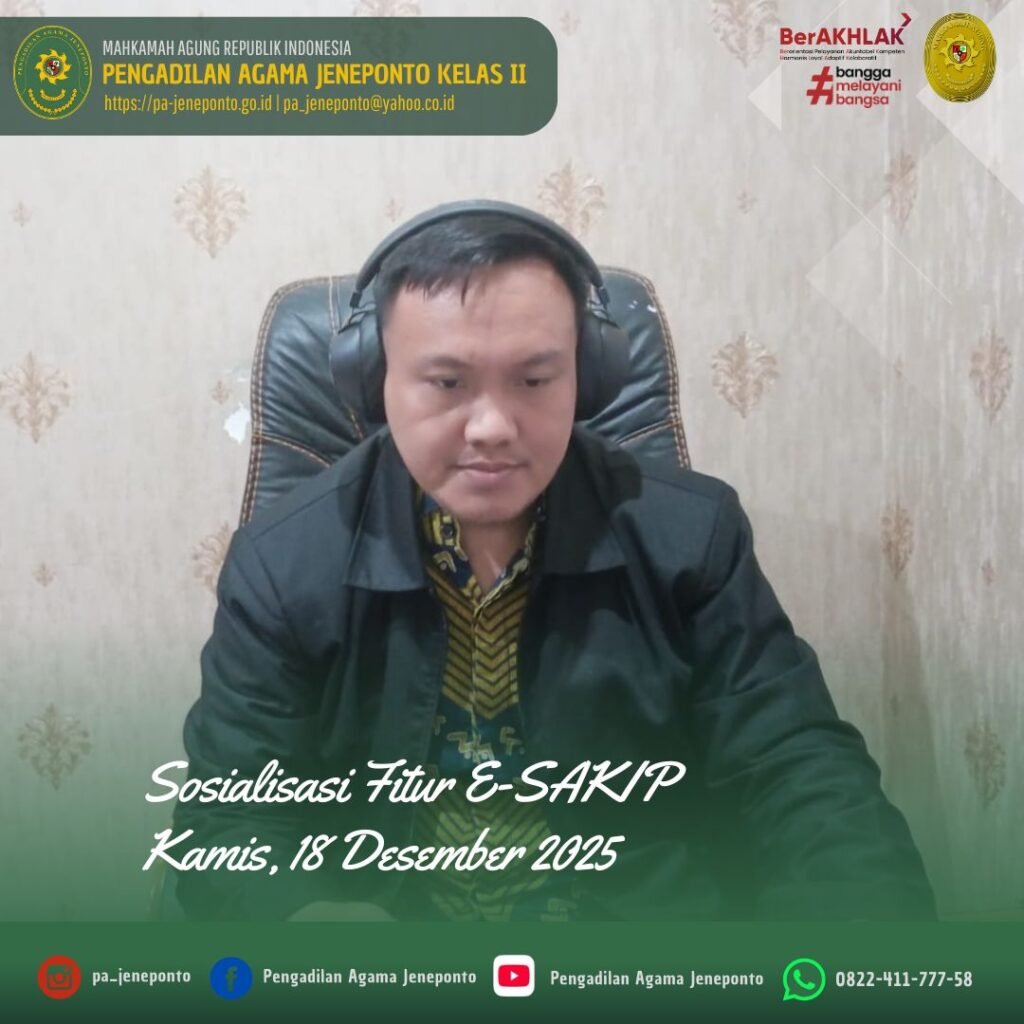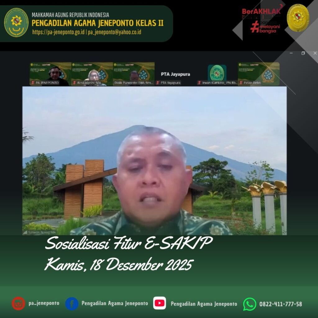 Kamis, jam 10.00 Wita s.d. selesai, bertempat di ruang IT Pengadilan Agama Jeneponto, Hendra Faizal Sanudin, S.H., Kasubbag. PTIP Pengadilan Agama Jeneponto, memenuhi Undangan Sosialisasi Fitur E-SAKIP pada Aplikasi BATARA oleh Badan Urusan Administrasi Mahkamah Agung RI, secara daring. Dalam kegiatan tersebut dijelaskan secara gamblang mengenai transformasi pelaporan satuan kerja yang selama ini di kenal dengan SAKIP (Sistem Akuntabilitas Kinerja Instansi Pemerintah) dari manual yang dikerjakan oleh masing-masing satuan kerja menjadi satu yang terintegrasi pada aplikasi BATARA (Budgeting and Planning Application for Transparency, Accuracy, and Resource Alignment) pada fitur menu E-SAKIP. Diharapkan dengan adanya kegiatan ini setiap operator atau pejabat yang bertanggung jawab atas pelaporan ini bisa lebih mudah dalam mengerjakan laporan serta penyajian data lebih terukur sesuai dengan Rencana Strategis Mahkamah Agung RI 2025-2029.
