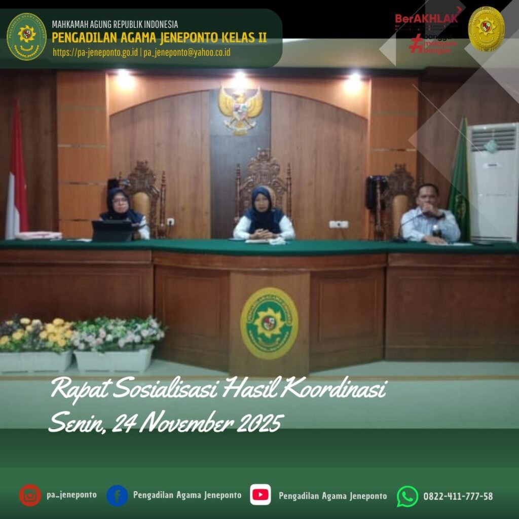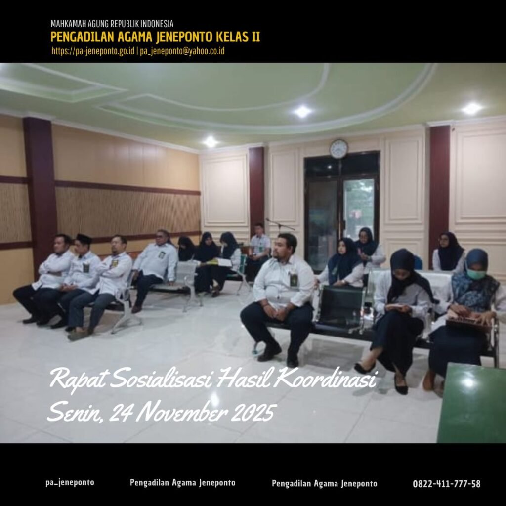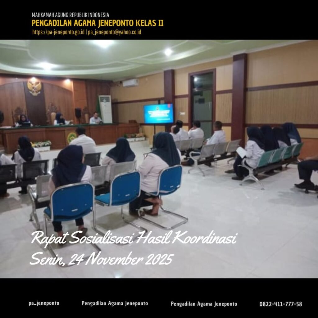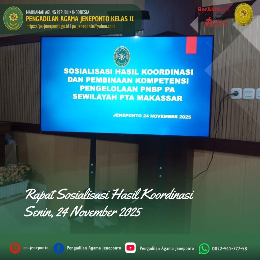 Senin pagi pukul 08.30 s.d. 10.00 Wita, Bertempat di Ruang Aula / Sidang Utama Pengadilan Agama Jeneponto, dilaksanakan rapat sosialisasi hasil koordinasi dan pembinaan kompetensi pengelolaan PNBP Pengadilan Agama se Wilayah Pengadilan Tinggi Agama Makassar, dan penyampaian rapat pemantapan Family Gathering persiapan di hari Sabtu-Ahad, tanggal 29-30 November 2025, oleh Pimpinan Pengadilan Agama Jeneponto dihadiri unsur pimpinan yaitu Ketua, Wakil Ketua, Hakim, Panitera dan Sekretaris Pengadilan Agama Jeneponto, Pejabat Struktural, Fungsional serta PPPK dan CPNS Pengadilan Agama Jeneponto.
