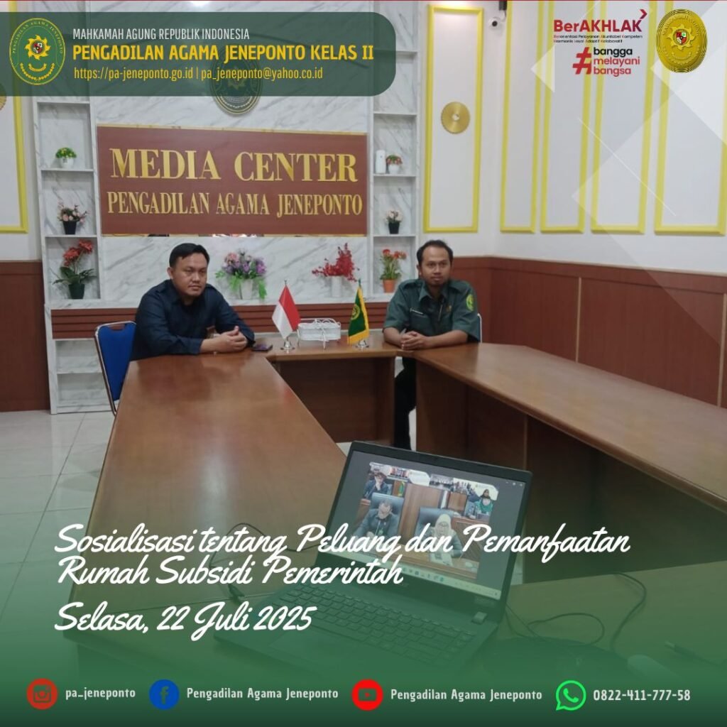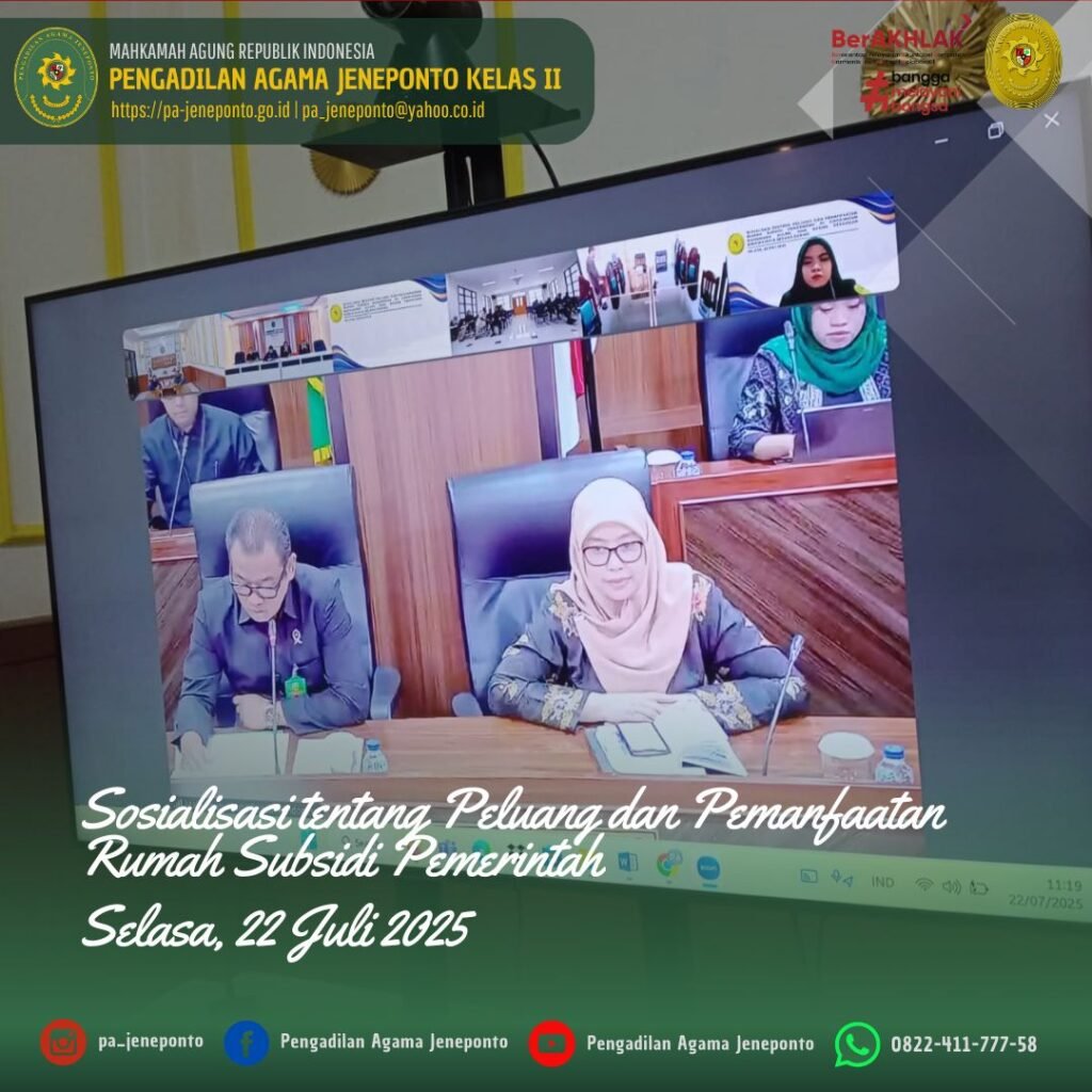Selasa pukul 10.00 s.d. selesai, bertempat di Media Center Pengadilan Agama Jeneponto, Hendra Faizal Sanudin, S.H., Kasubag. PTIP dan Muh. Ikhwan Triantoro, S.T., CPNS Pengadilan Agama Jeneponto, mengikuti Zoom Meeting dengan tema “Sosialisasi tentang Peluang dan Pemanfaatan Rumah Subsidi Pemerintah di Lingkungan Mahkamah Agung dan Badan Peradilan dibawahnya”, secara daring.