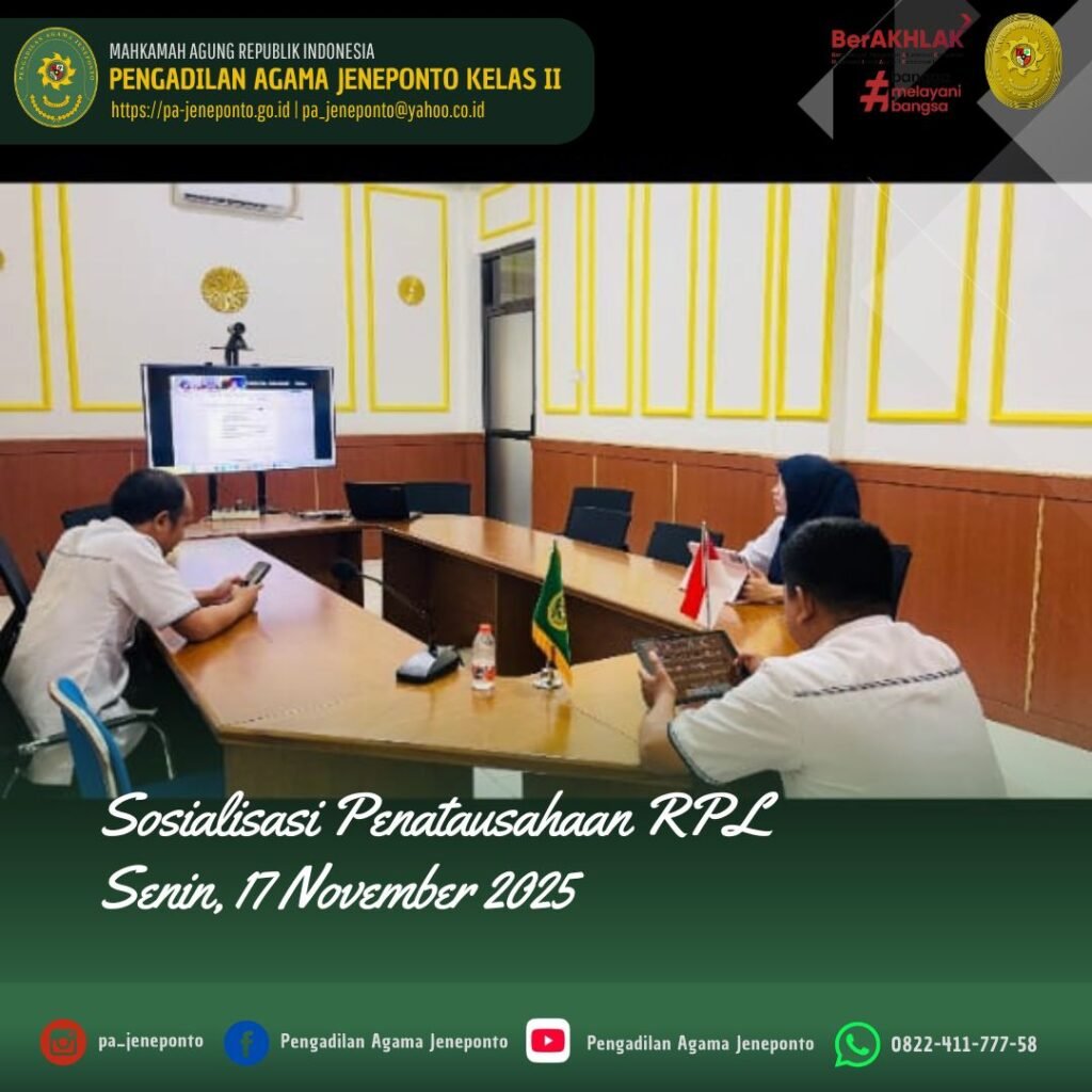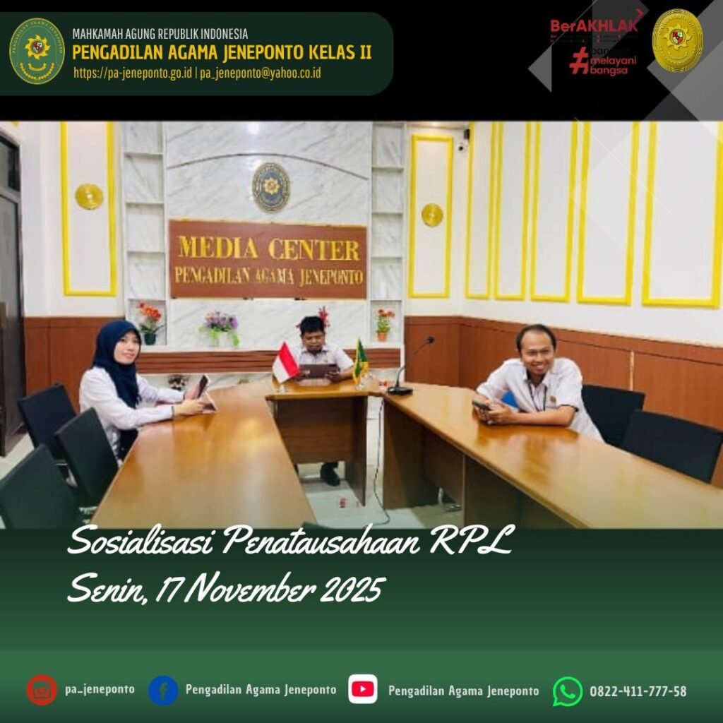 Senin siang 14.00 Wita s.d. selesai, bertempat di Media Center Pengadilan Agama Jeneponto, Ibu Amel Ryski Prasilya R. Abas. P, S.H., Analis Perkara Peradilan, Bapak Ikhwan Triantoro, S.T., CPNS Teknisi Sarana dan Prasarana, Bapak Muh. Nurul Ulum. R, S.E.I., PPPK Penata Layanan Operasional mengikuti zoom dengan Topik Sosialisasi Penatausahaan RPL dalam rangka tindaklanjut temuan BPK  dan Pendampingan Pengajuan Tunjangan Kinerja Bulan Desember 2025.