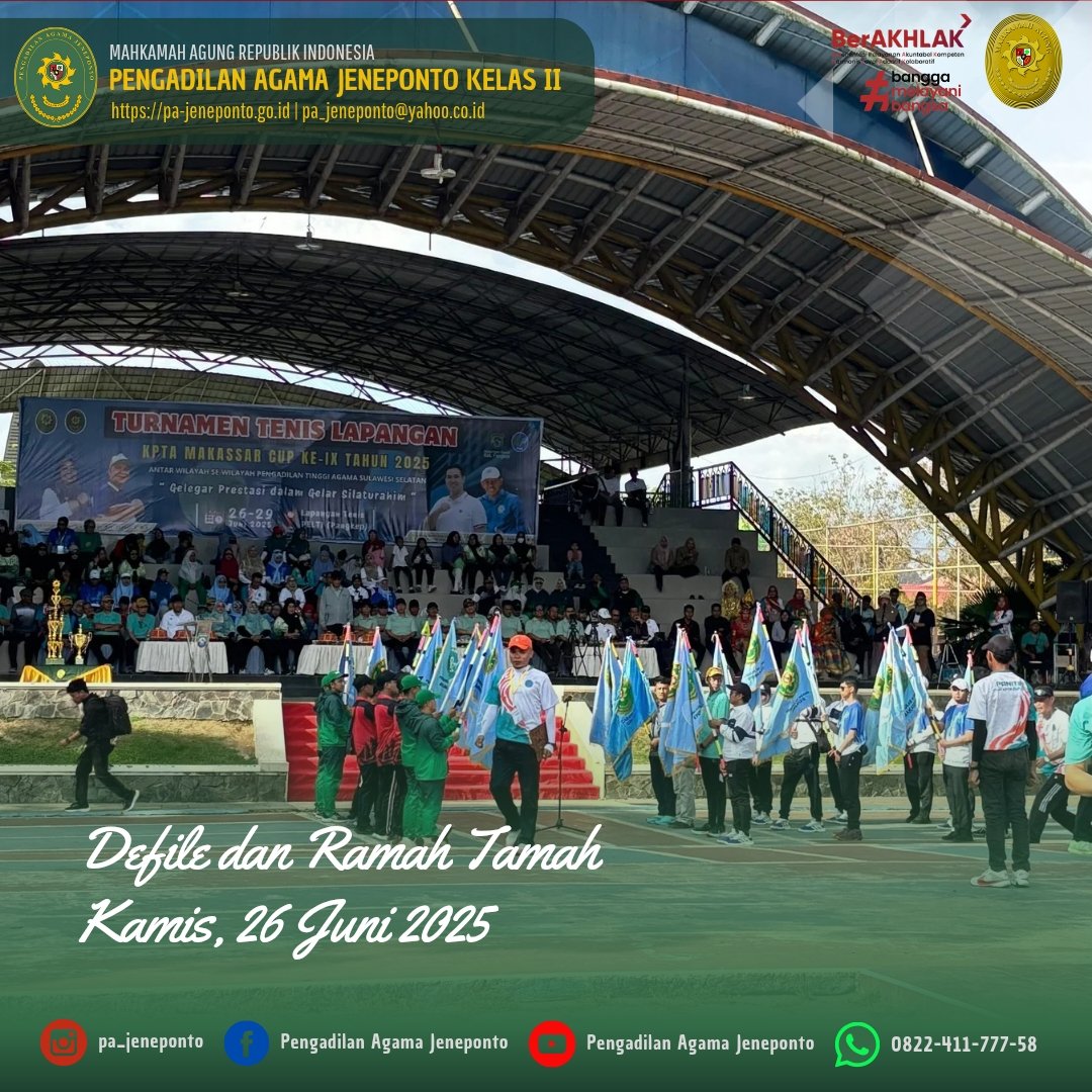 Dalam rangka memeriahkan kegiatan tahunan Turnamen Tenis Lapangan KPTA Cup ke IX Tahun 2025 di Lapangan Citra Mas Kabupaten Pangkep, Pengadilan Agama Jeneponto tergabung dalam wilayah IV bersama Pengadilan Agama Bantaeng, Pengadilan Agama Bulukumba dan Pengadilan Agama Selayar.