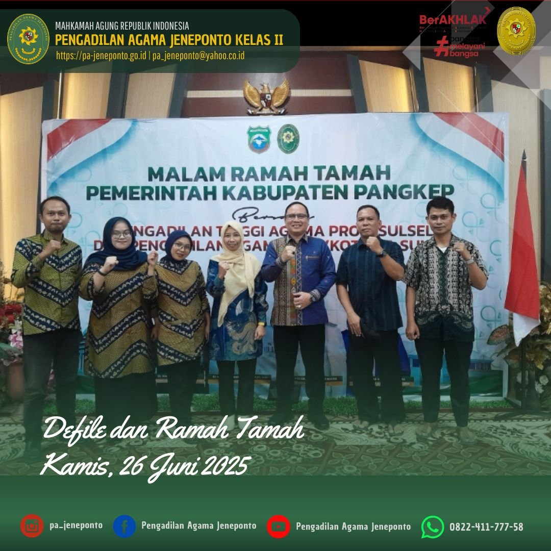 Malam hari dilanjut dengan Ramah Tamah di Rumah Jabatan Bupati Kabupeten Pangkep, malam khidmat dihadiri langsung oleh Ketua Pengadilan Agama Jeneponto Ibu Fadilah, S.Ag., M.H., Sekretaris Pengadilan Agama Jeneponto Bapak Abdul Muiz, S.H., M.H dan Panitera Pengadilan Agama Jeneponto Bapak Muhyiddin, S.H.I.,M.H., beserta rombongan atlet Pengadilan Agama Jeneponto. Kegiatan akbar ini akan berlangsung sejak tanggal 26-29 Juni 2025.
