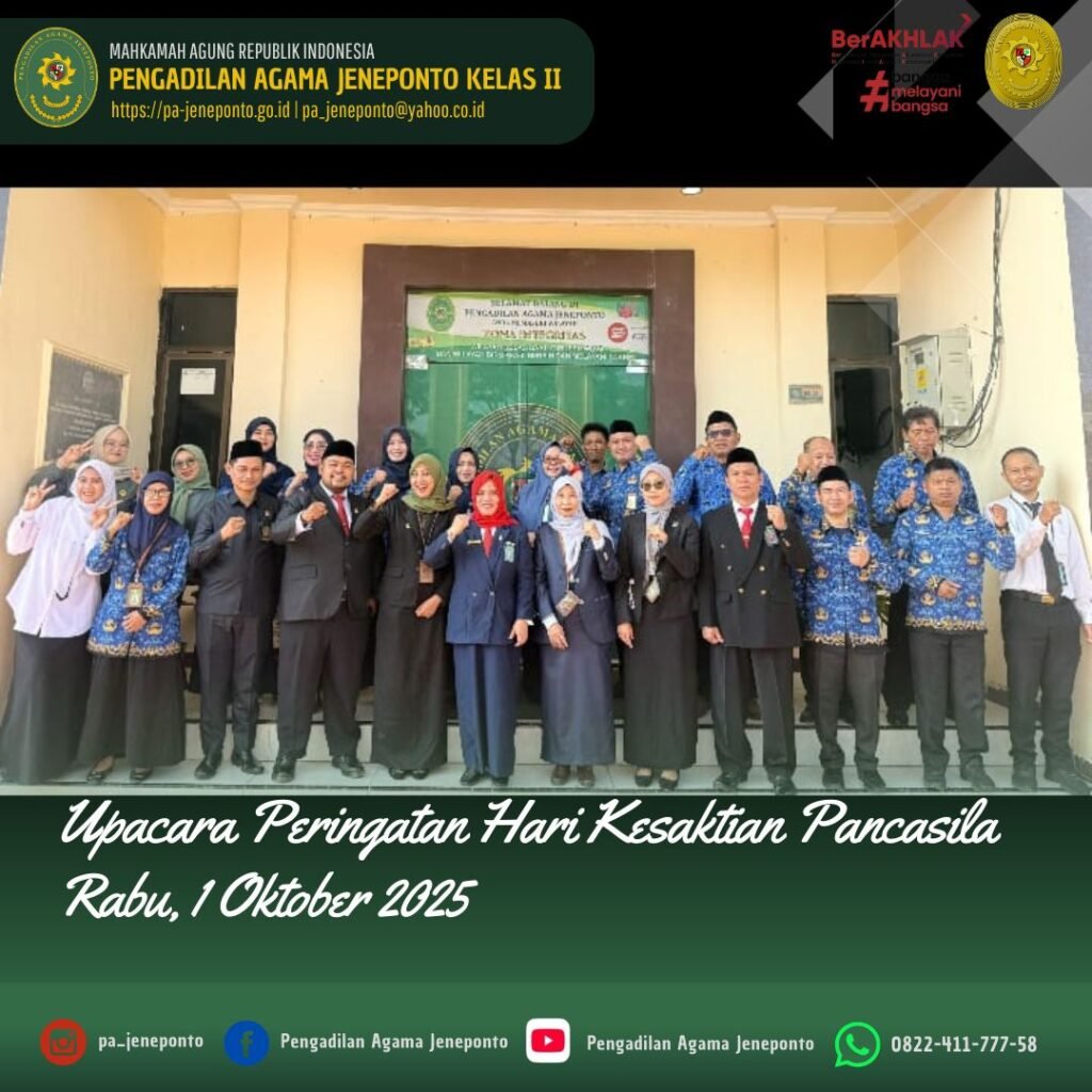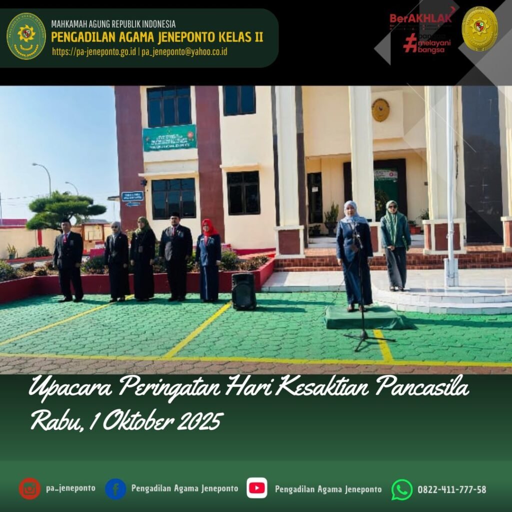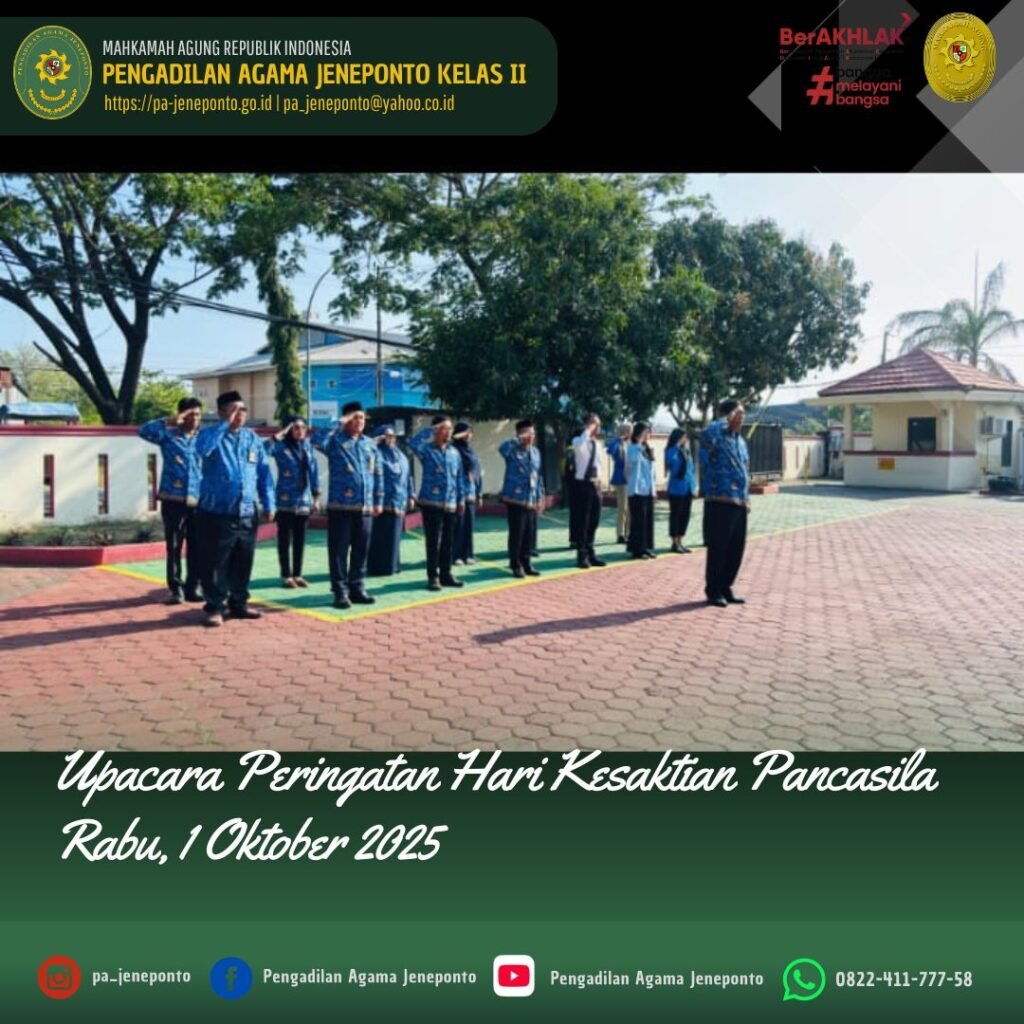 Segenap Aparatur Pengadilan Agama Jeneponto menggelar Upacara Memperingati Hari Kesaktian Pancasila Tahun 2025 pada tanggal 1 Oktober 2025 di Halaman Utama Kantor Pengadilan Agama Jeneponto. Upacara yang dilaksanakan pada pukul 08.00 dengan dipimpin langsung oleh Ketua Pengadilan Agama Jeneponto, Fadilah, S.Ag.,M.H. yang bertindak Komandan Upacara, Patta Djalo. Peserta Upacara Ketua, Hakim, Sekretaris, Seluruh Pejabat Struktural dan Fungsional serta PPPK dan Pengadilan Agama Jeneponto, serta siswa PKL.