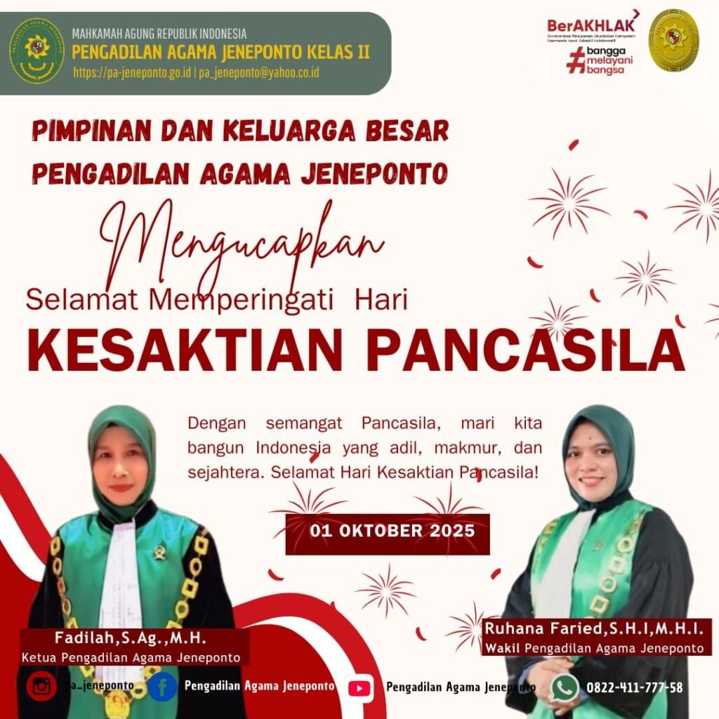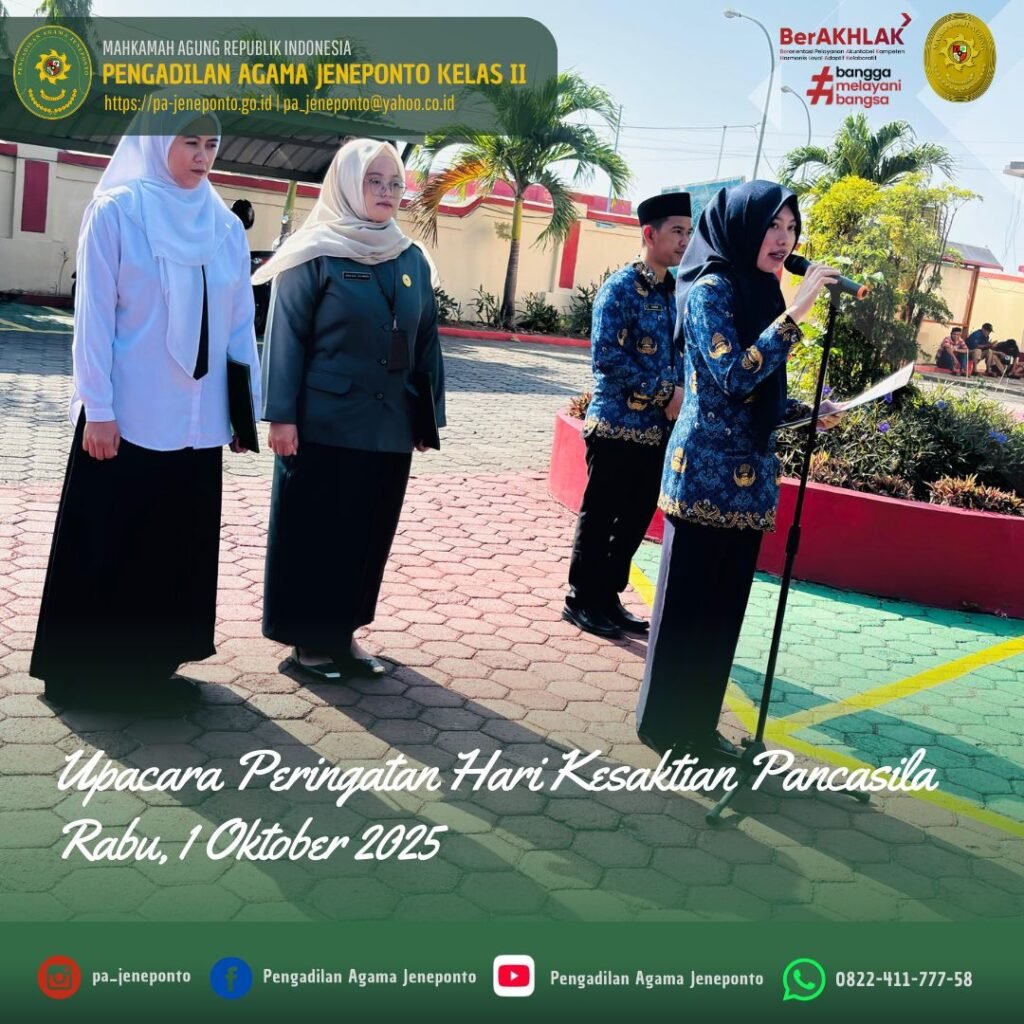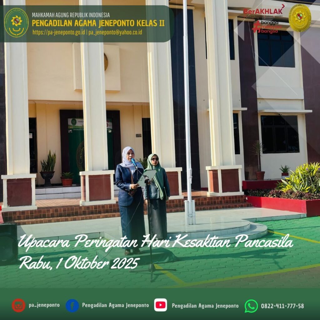 Segenap Aparatur Pengadilan Agama Jeneponto menggelar Upacara Memperingati Hari Kesaktian Pancasila Tahun 2025 pada tanggal 1 Oktober 2025 di Halaman Utama Kantor Pengadilan Agama Jeneponto. Upacara yang dilaksanakan pada pukul 08.00 dengan dipimpin langsung oleh Ketua Pengadilan Agama Jeneponto, Fadilah, S.Ag.,M.H. yang bertindak Komandan Upacara, Patta Djalo. Peserta Upacara Ketua, Hakim, Sekretaris, Seluruh Pejabat Struktural dan Fungsional serta PPPK dan Pengadilan Agama Jeneponto, serta siswa PKL.